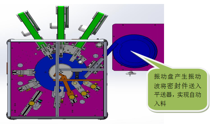 1. 自动送料系统:将密封件倒入振动盘,振动盘产生振动波,让密封件有序地排列到入料平送器上实现排料入料功能。