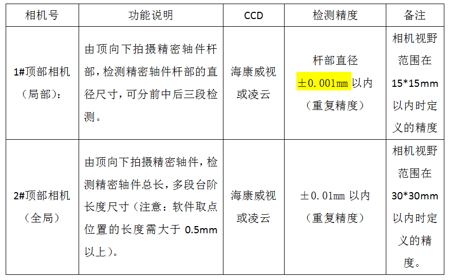 3. 视觉检测系统:由2套相机及相应光源组成,分配如下: