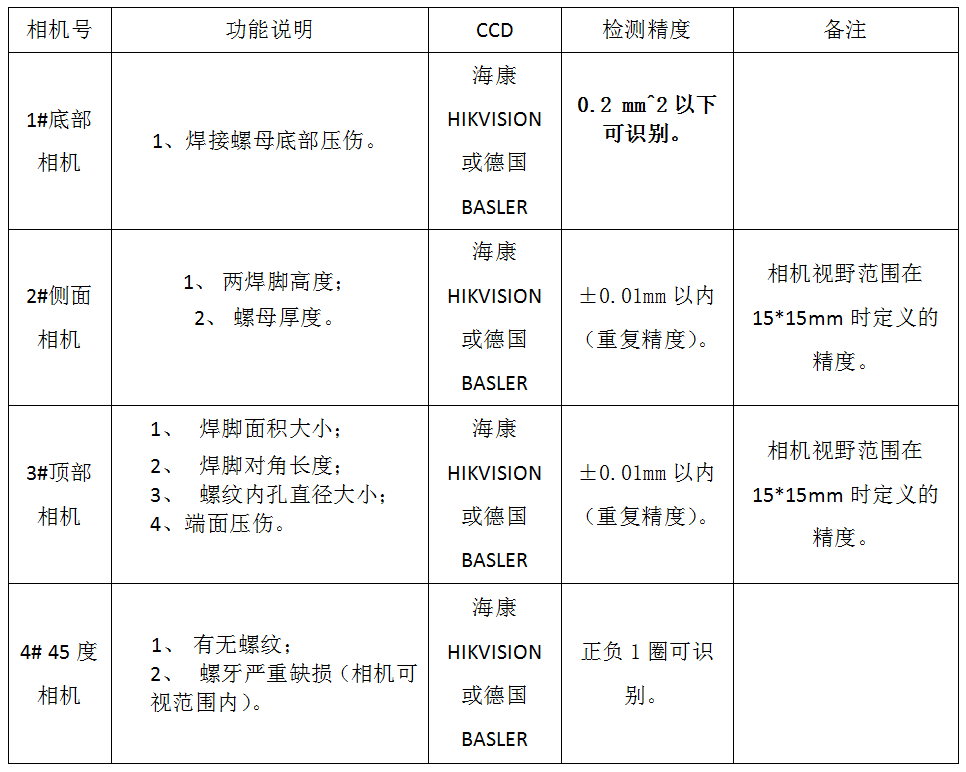 3.视觉检测系统:由4套相机及相应光源组成,分别实现对1)焊接螺母底部表面,2)螺母侧面投影尺寸,3)螺母顶部表面及投影尺寸,4)螺牙有无以及严重缺损等项目进行检测,具体见下第四条列明。